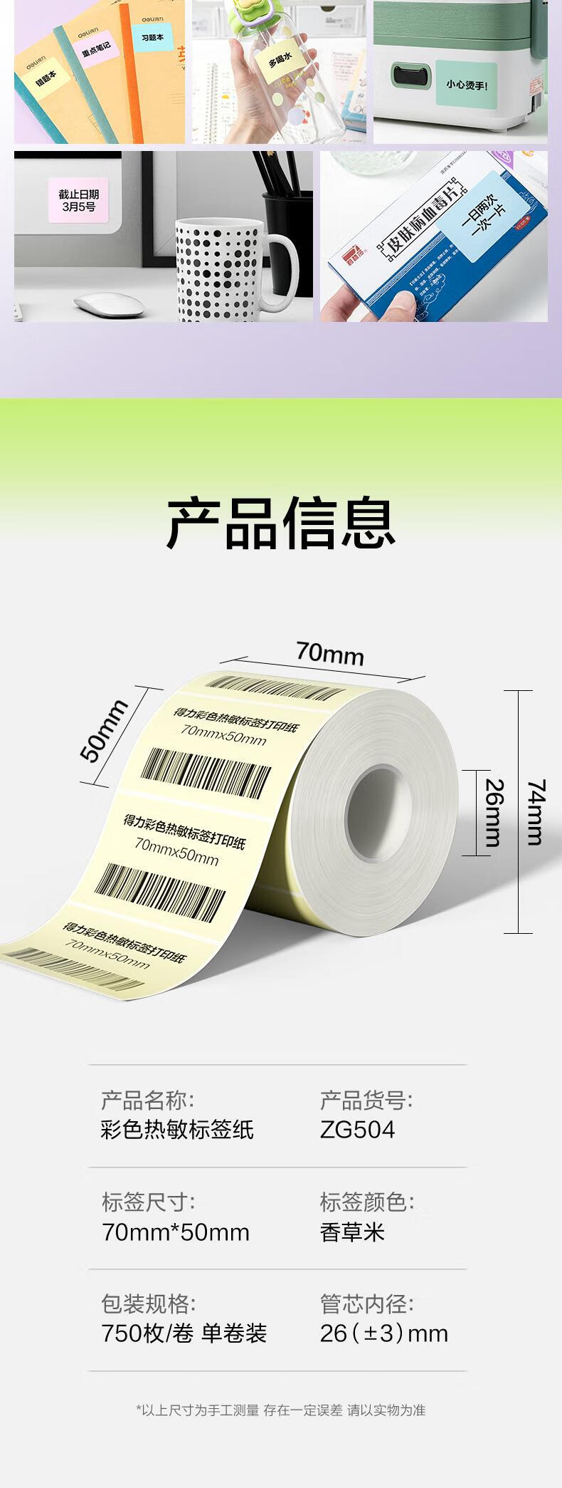得力(deli)三防彩色热敏标签纸 70*50mm 750张*1卷 米黄色热敏标签打印纸 食品服饰标签纸 ZG504