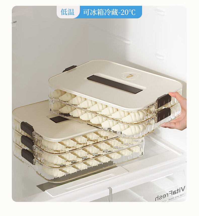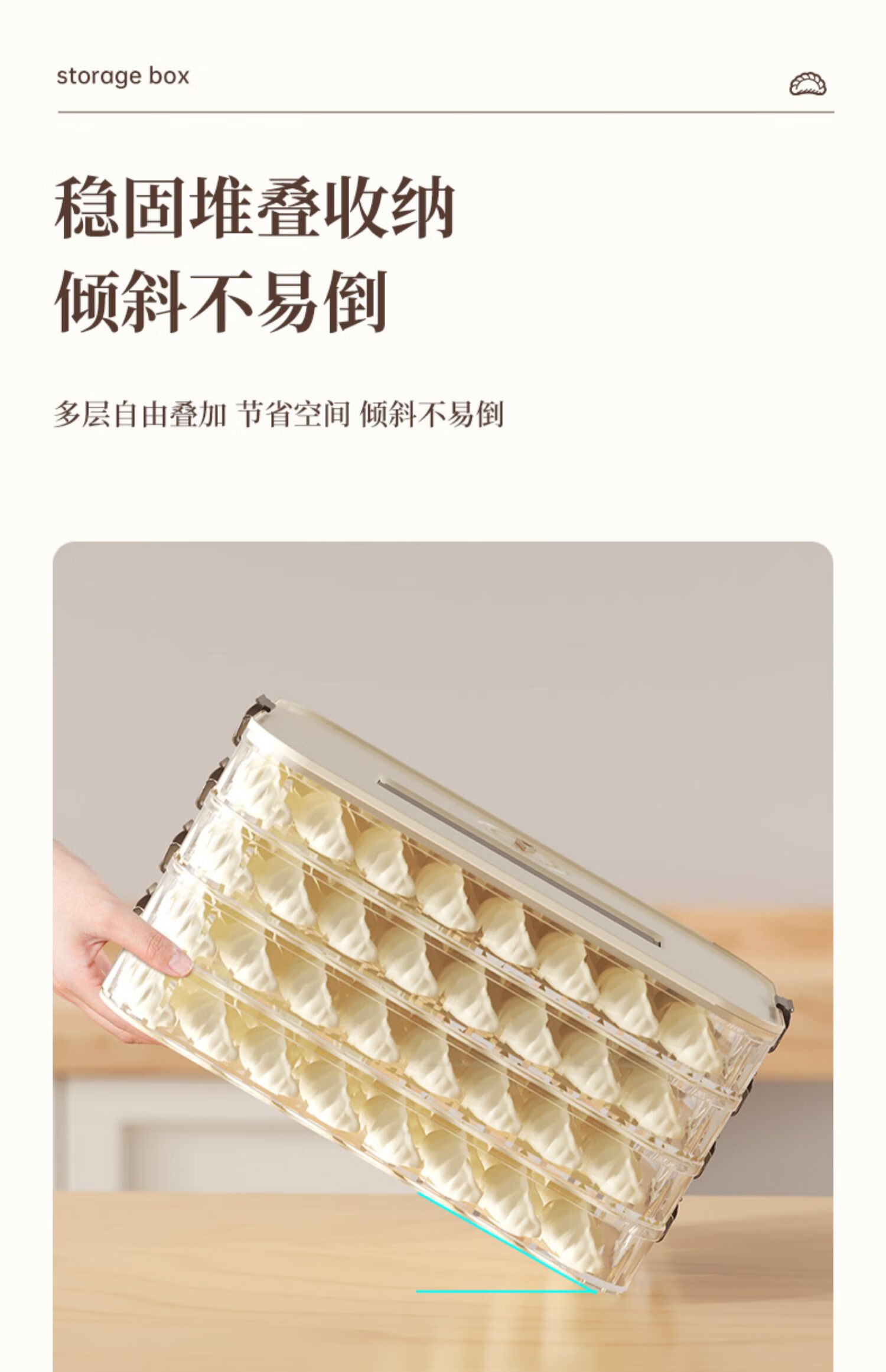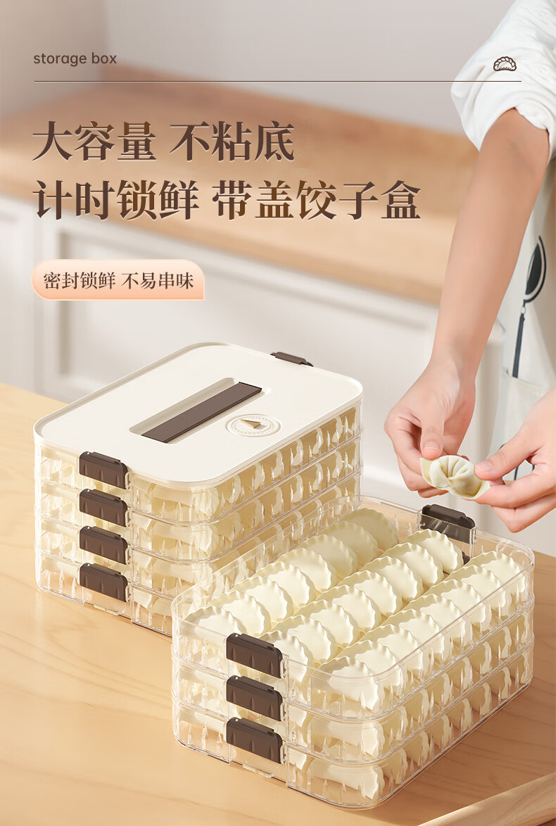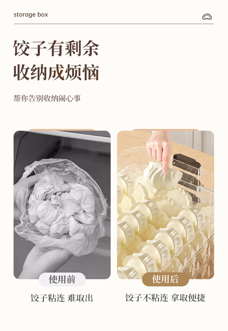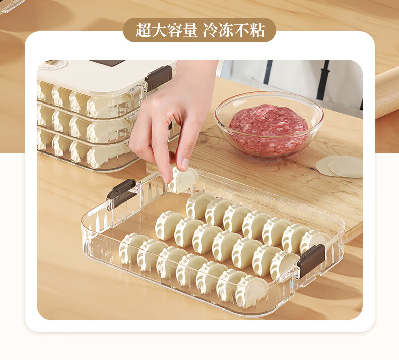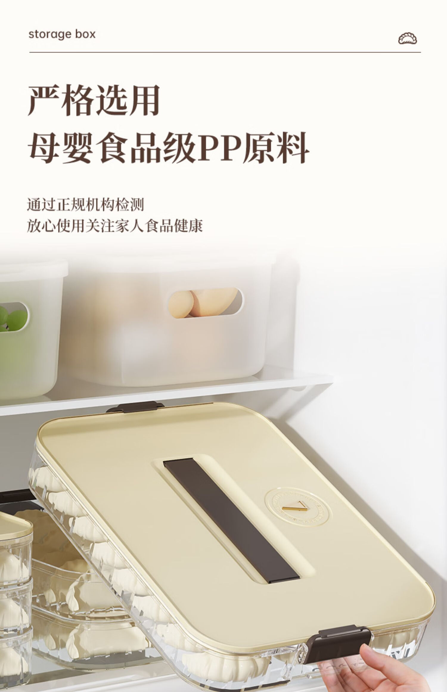 稻草熊家用饺子盒带盖加大收纳盒冰箱保鲜盒加厚食品级冷冻水饺馄饨盒 奶油白【二层一盖】可装120个饺子 不粘底冻裂包赔