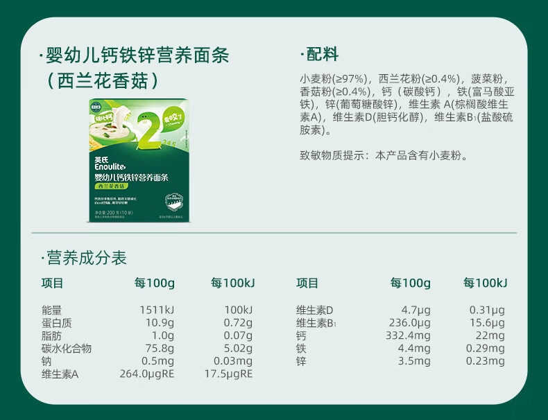 英氏婴幼儿面条西兰花香菇味200g 婴儿辅食儿童早餐营养面 采销真验厂
