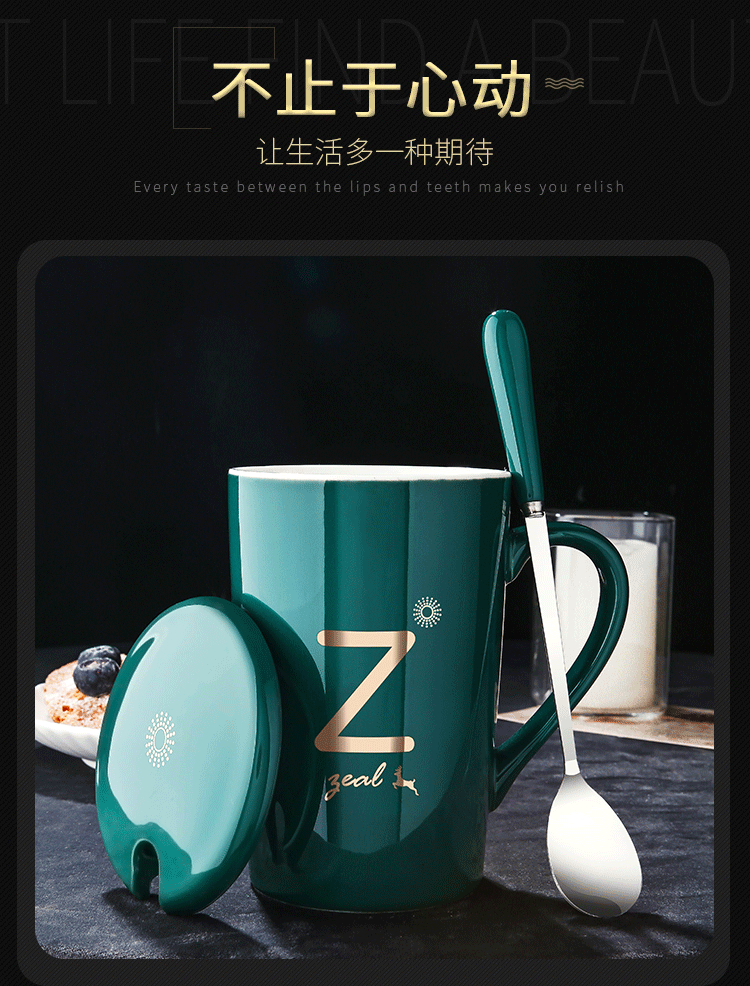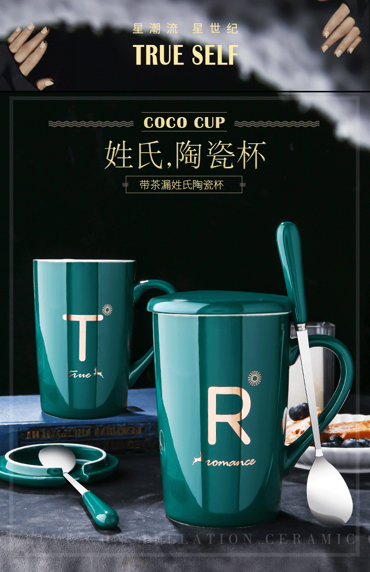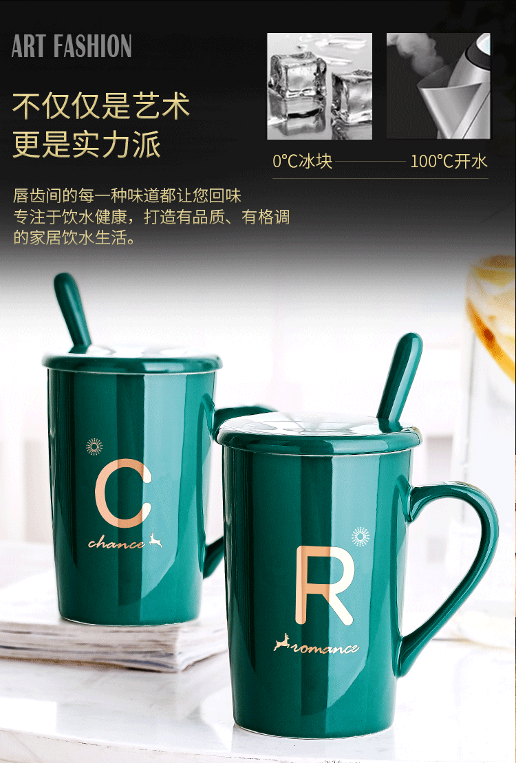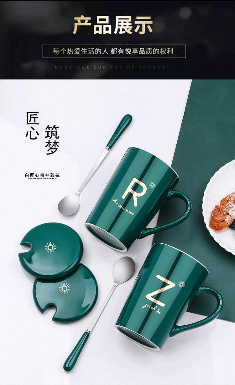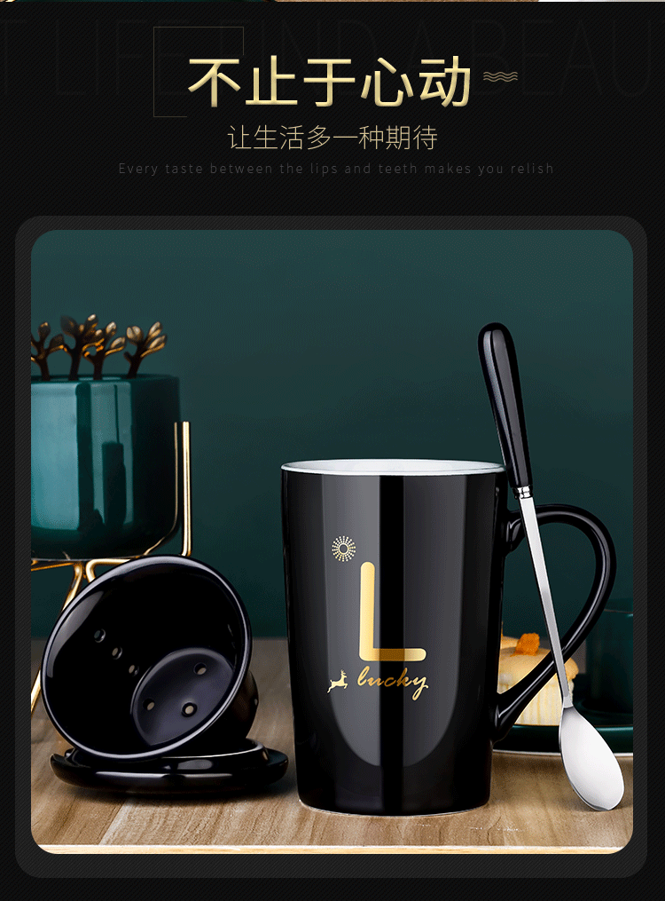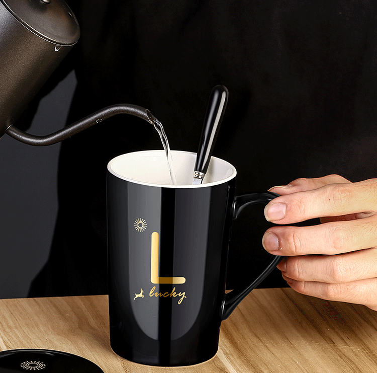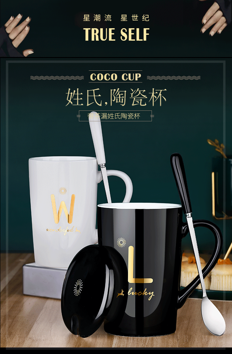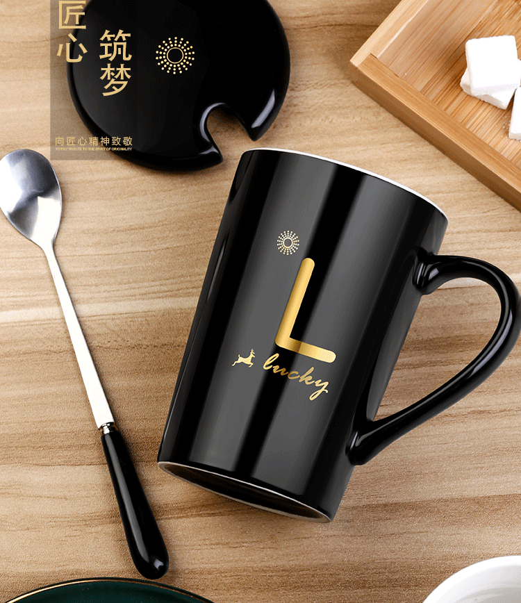 DEATKN茶杯马克杯带盖勺男女陶瓷杯子家用韩版学生情侣牛奶咖啡杯大容量 L姓 经典白(杯+陶瓷盖+陶瓷勺)