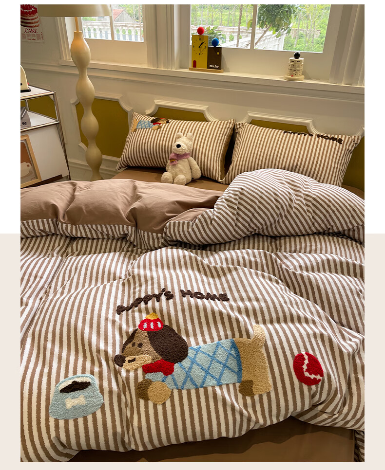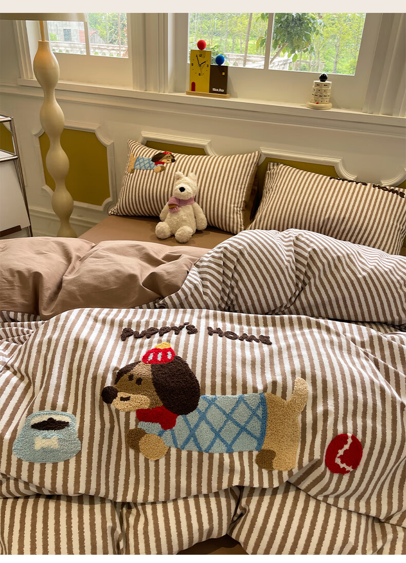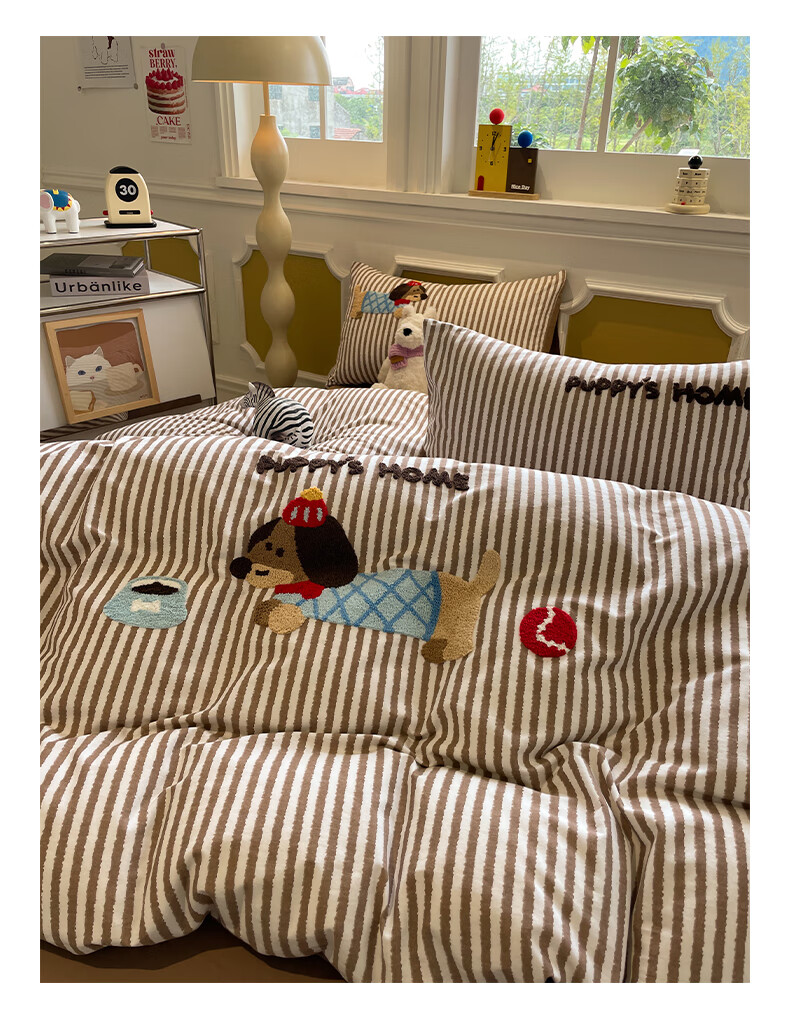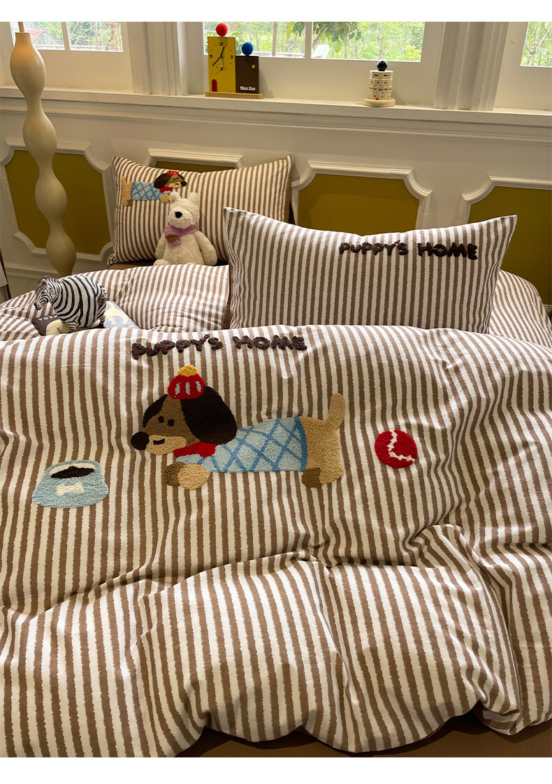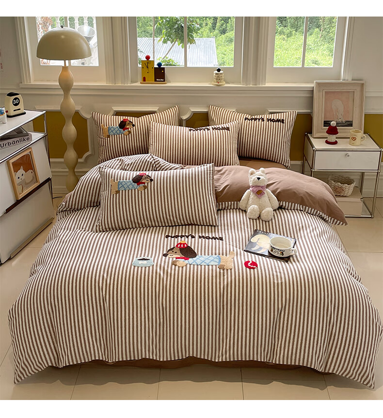 猫人A类全棉毛巾绣床上四件套纯棉磨毛床单被套床笠学生宿舍三件套 竖条腊肠狗【100%全棉面料】 1.8m 床笠款 四件套-200x230cm被套