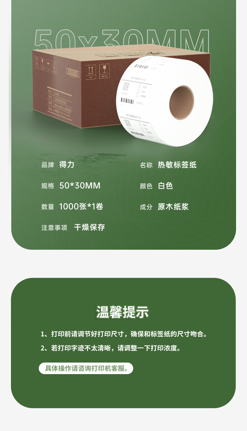 得力(deli)50*30mm1000张*1卷 珊瑚海三防热敏标签纸 奶茶服饰不干胶打印纸 12003【适配3寸标签机720C等】