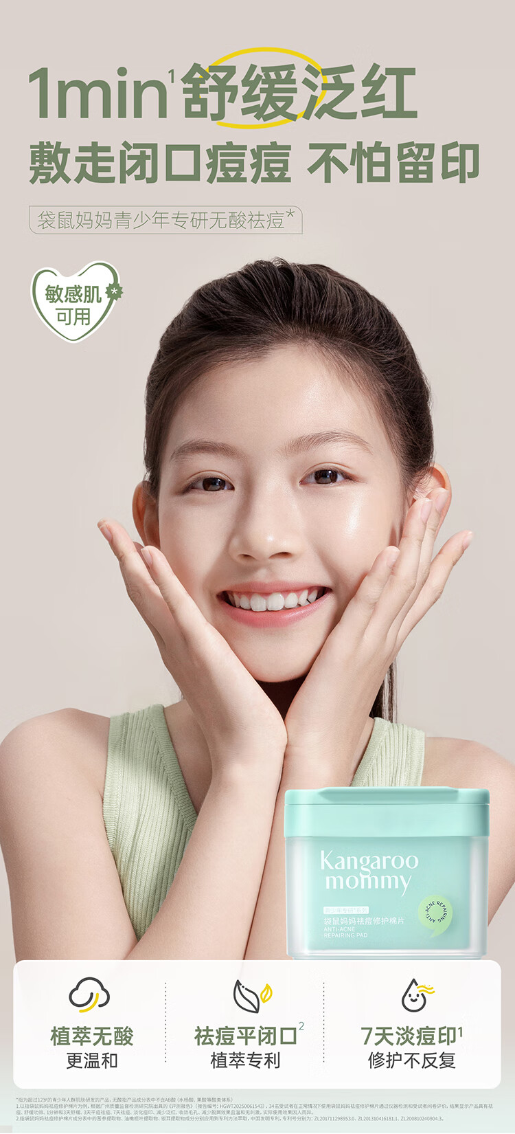 袋鼠妈妈(Kangaroo Mommy)青少年祛痘棉片净痘闭口粉刺黑头清洁收缩毛孔修护痘痘肌 祛痘棉片100片