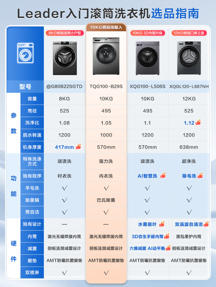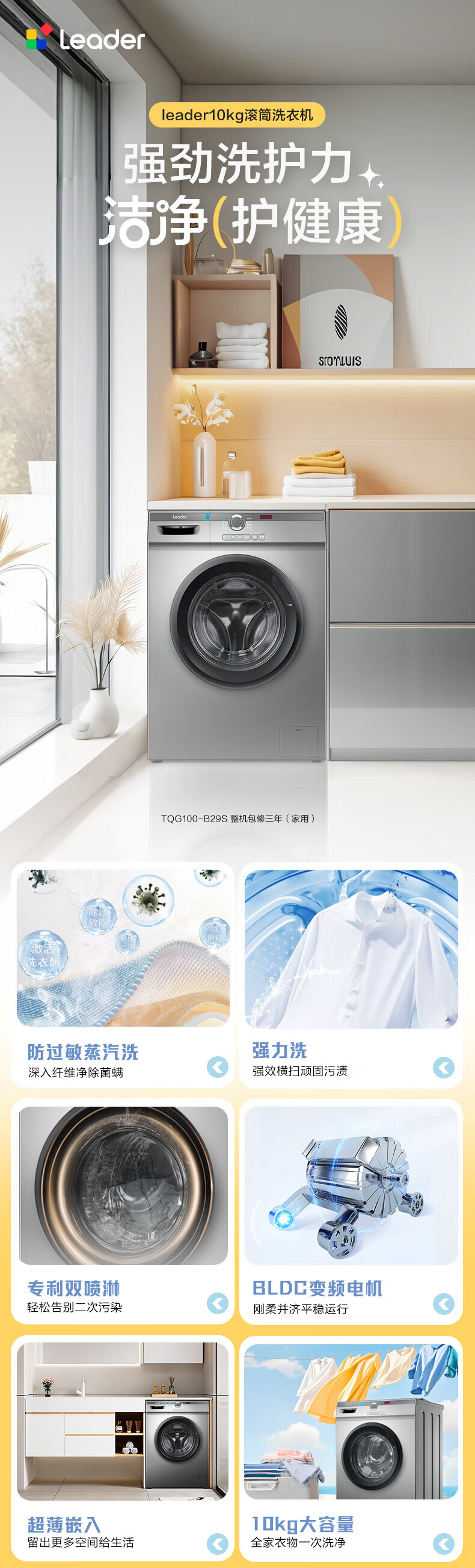 统帅(Leader)海尔智家出品滚筒洗衣机全自动京东自营 10公斤家用超薄一级能效 以旧换新国家补贴TQG100-B29S