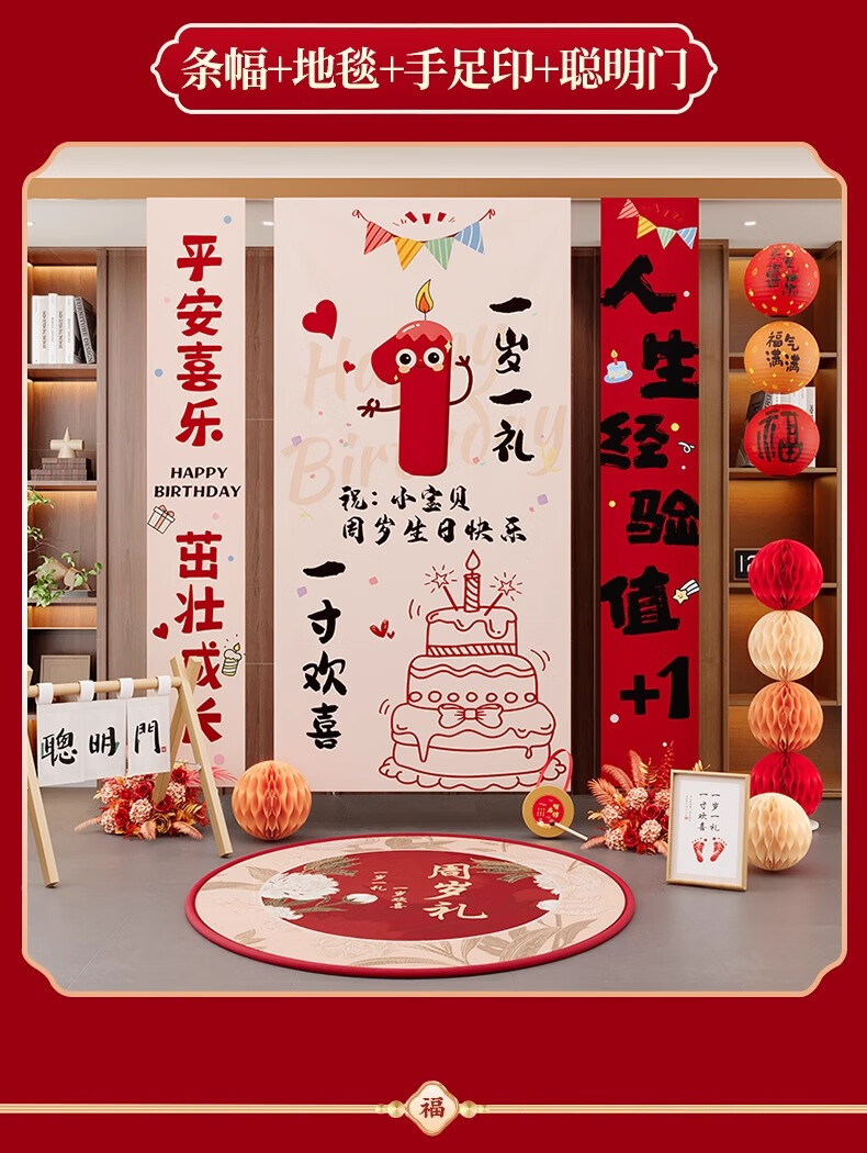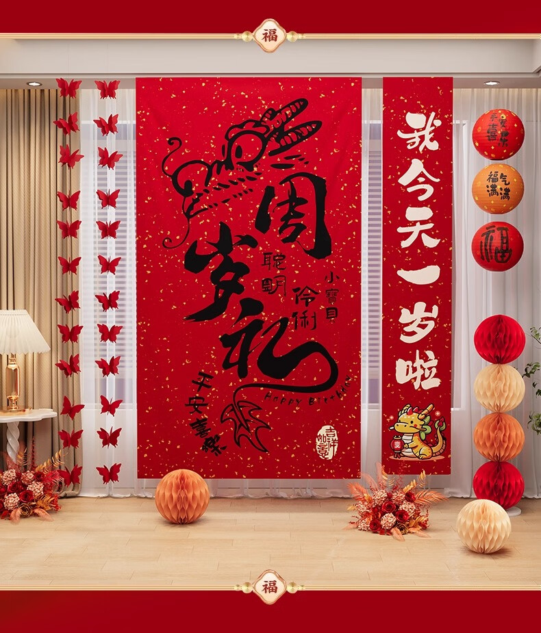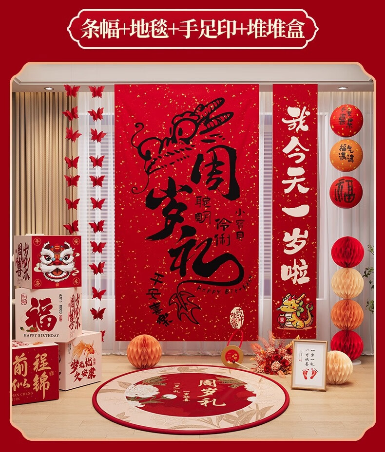 抓周一周岁龙宝宝生日场景布置装饰条幅儿童抓周礼道具用品挂布背景墙 周岁礼条幅