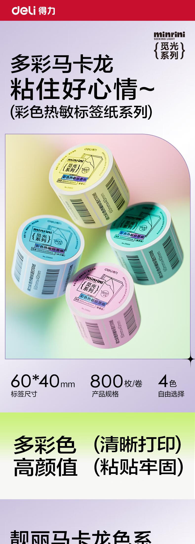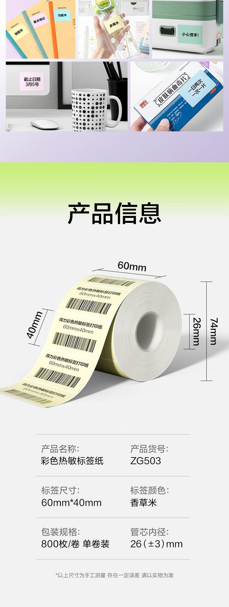 得力(deli)三防彩色热敏标签纸 60*40mm 800张*1卷 米黄色热敏标签打印纸 食品服饰标签纸 ZG503