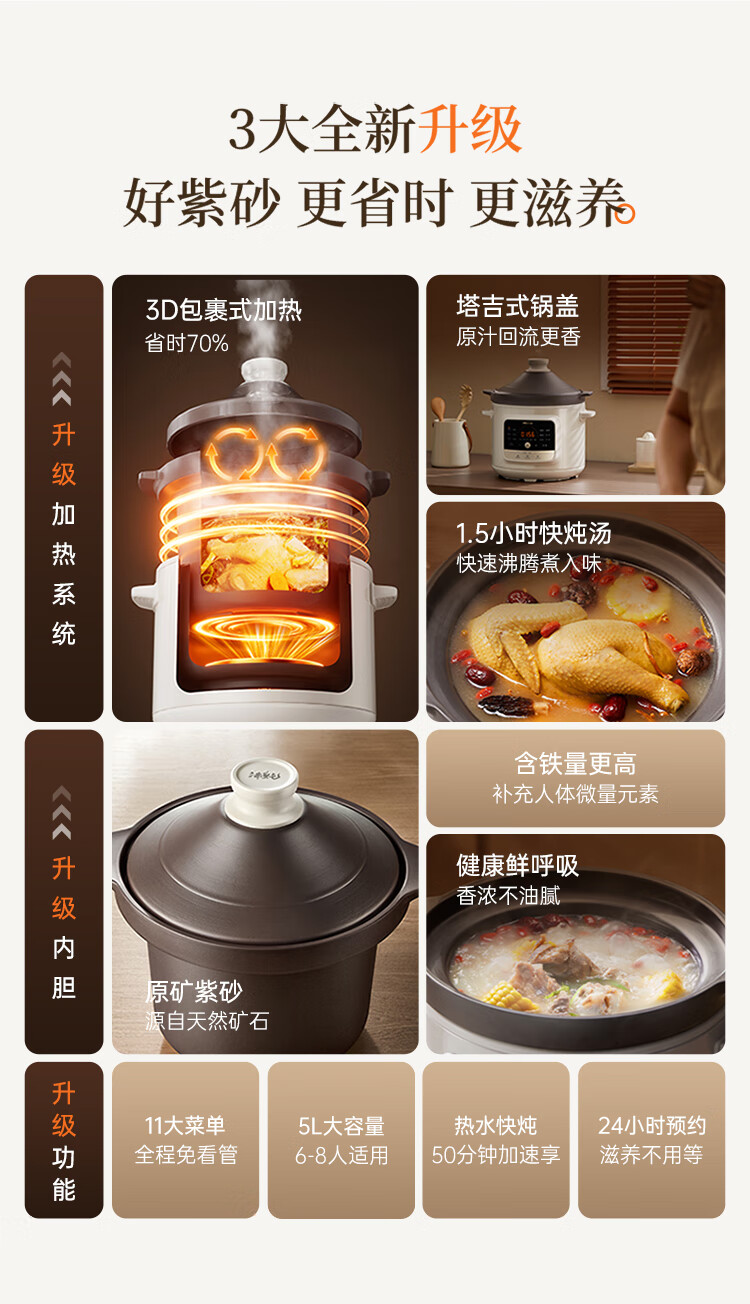 小熊(Bear)电炖锅 电砂锅 煲汤锅炖汤锅 紫砂锅炖汤盅电炖锅燕窝炖盅 煮粥神器 熬粥锅 大容量5L DDG-S50H8