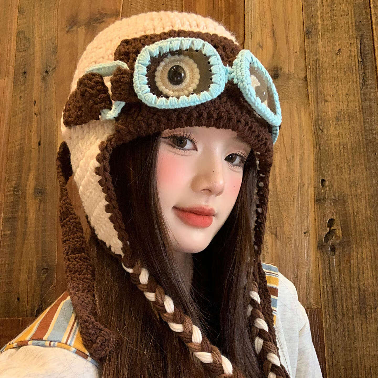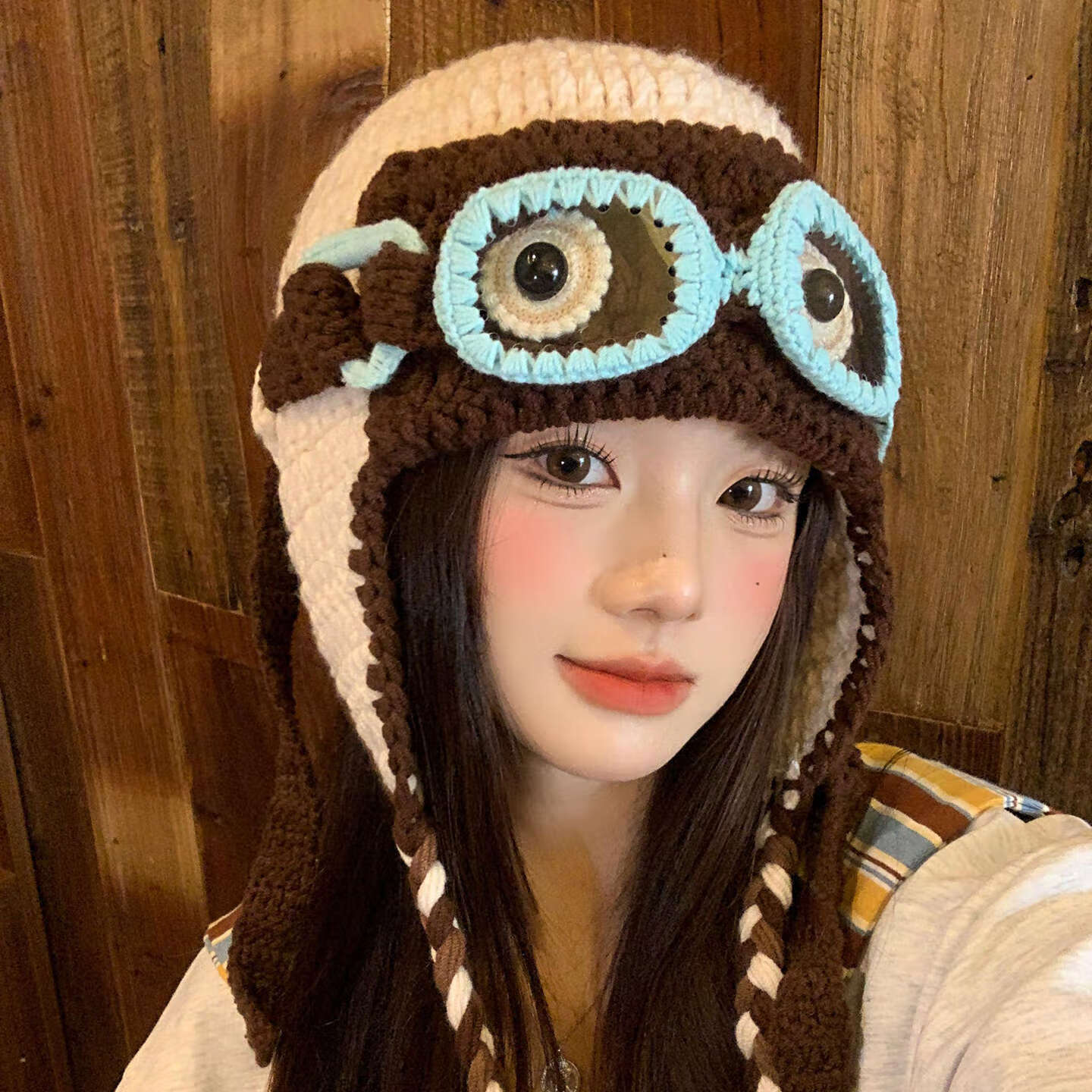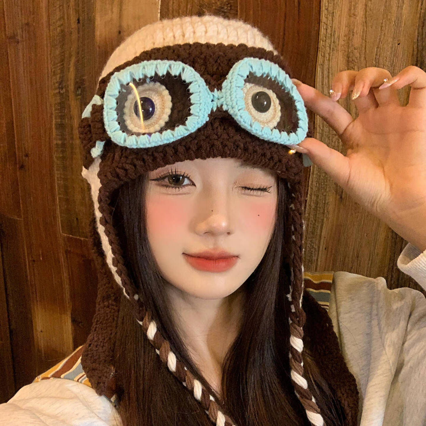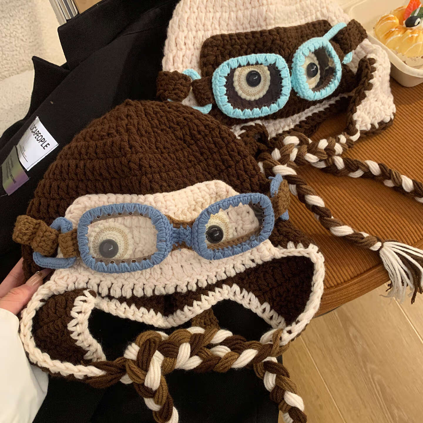 朋意毛线帽明星同款搞怪眼镜毛线帽女秋冬针织飞行帽保暖包头帽子 搞怪毛线帽-大眼睛-咖啡色 【明星同款】