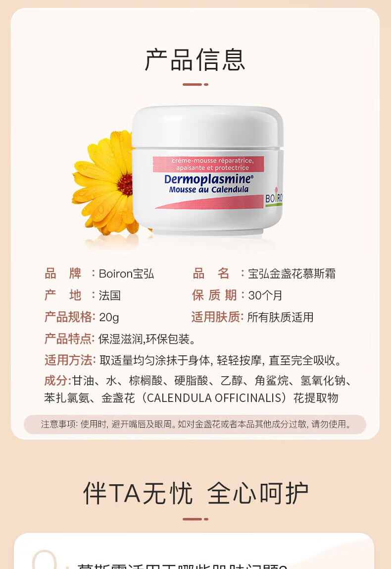 boiron宝弘金盏花面霜20g 法国进口秋冬儿童保湿滋润补水舒缓面霜0-12岁